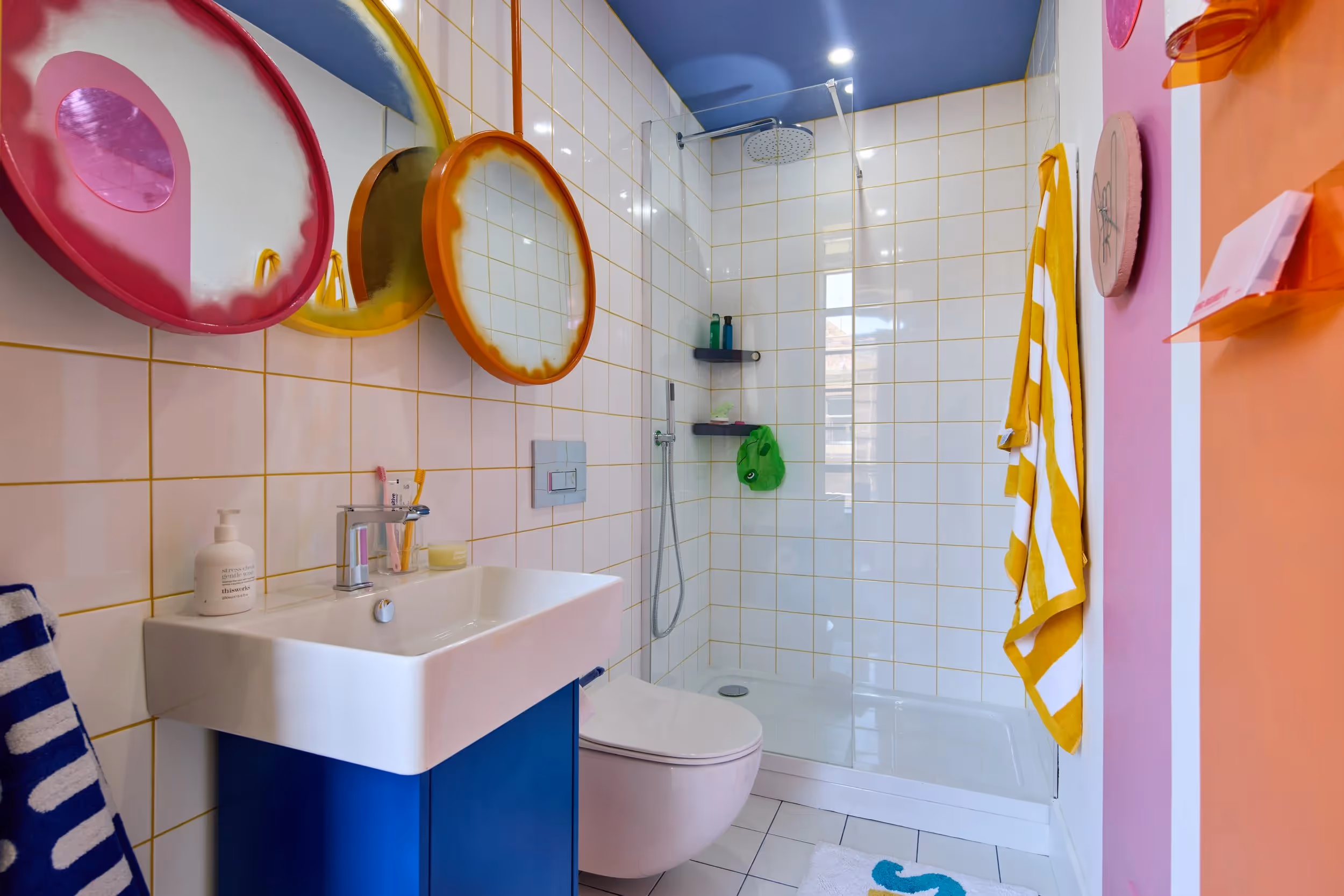 Designed by Justine Guillermou, from London who left the show in week 4, the apartment is brimming with colour from top to toe – the kitchen cabinet alone is made of fuchsia, orange and yellow, while the bedroom pops with bold patterns, vibrant colours and exposed brickwork.