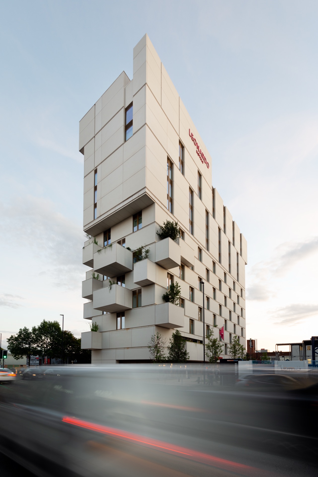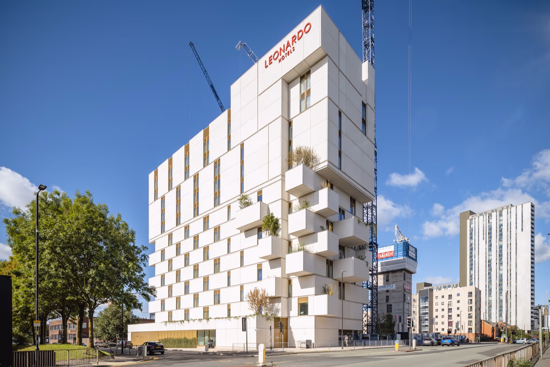 Inspired by Milan's Bosco Verticale, Mary Martin's Expanding Form sculpture, and Alan Turing's black and white computer programs developed in Manchester, the 13-storey landmark stacks white panels, projecting balconies and lush, overflowing planters to create a striking silhouette that scooped a design award from the Manchester Society of Architects before it even opened its doors.